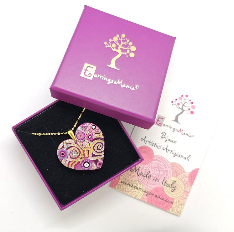 Splendido Ciondolo artistico artigianale della serie Klimt He-Art, in leggerissima argilla polimerica, interamente realizzato e dipinto a mano nel nostro laboratorio ed ispirato all'affascinante arte di Gustav Klimt.