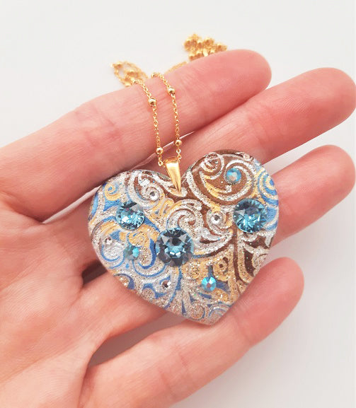 Precious Heart Aquamarine - Pendente a cuore con catenina, montatura in Argento placcato Oro 24 kt